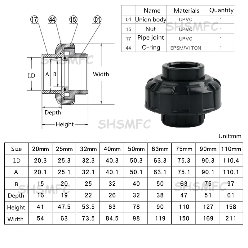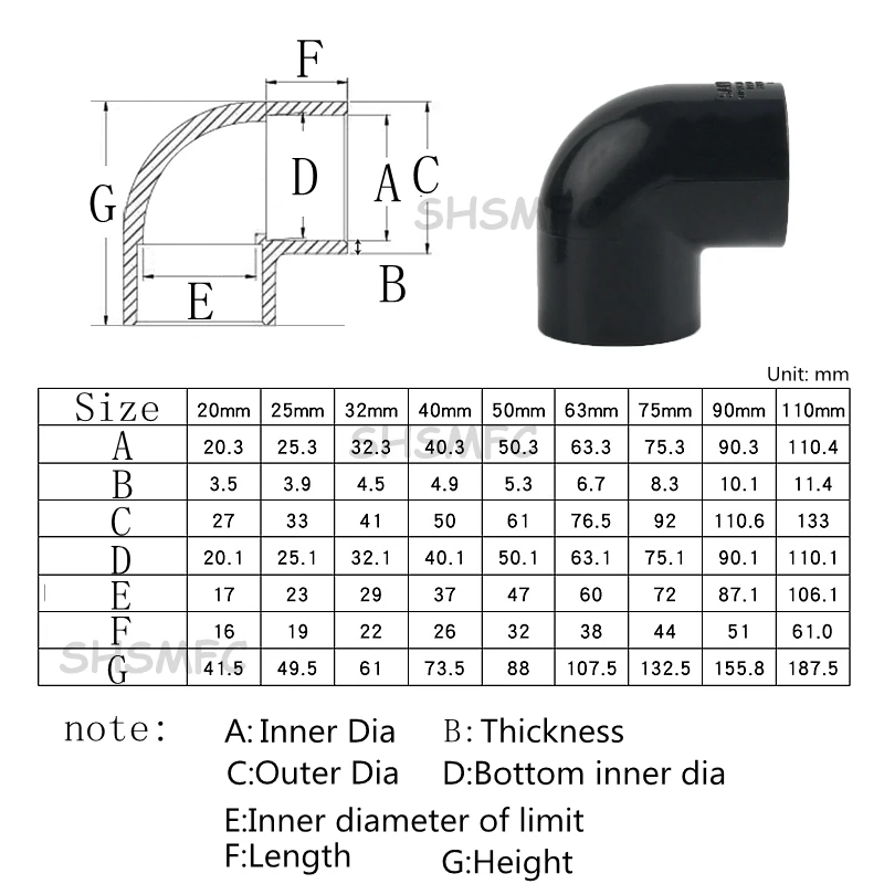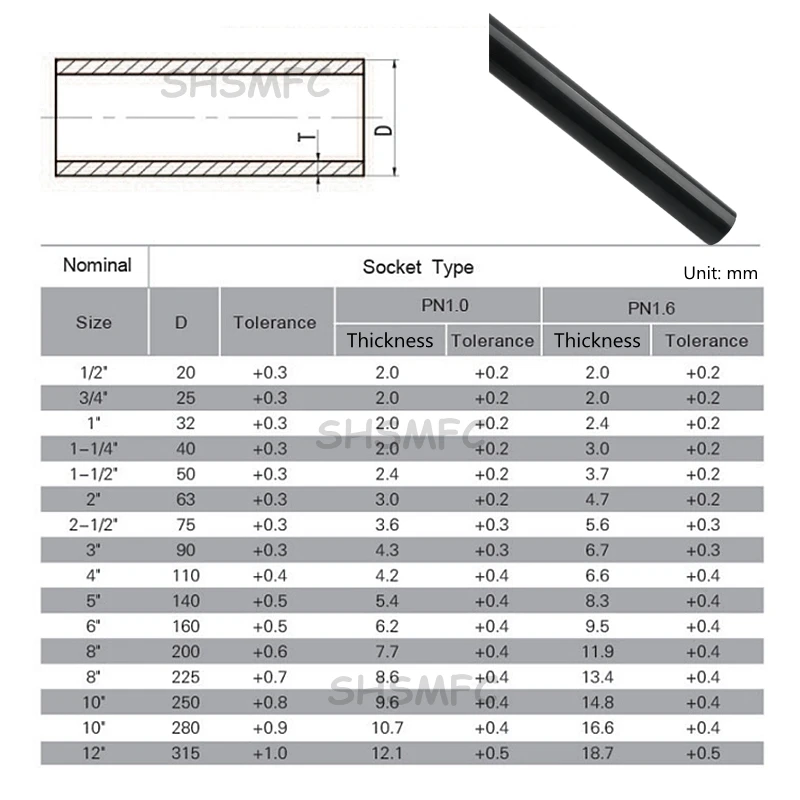 Nota: o tamanho do tubo UPVC é o diâmetro externo e outros produtos são o diâmetro interno